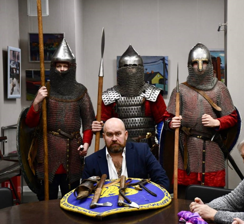 Участники увидели демонстрацию средневековой экипировки русских воинов: шлемы, кольчуги, щиты и мечи. После представления гости могли подержать оружие в руках.